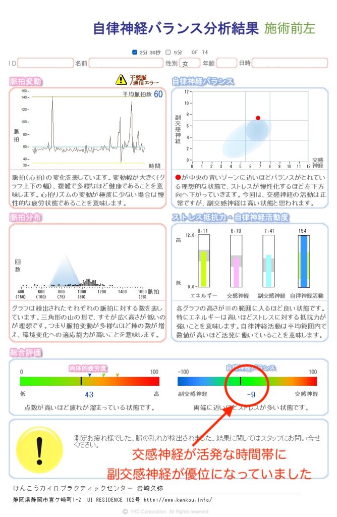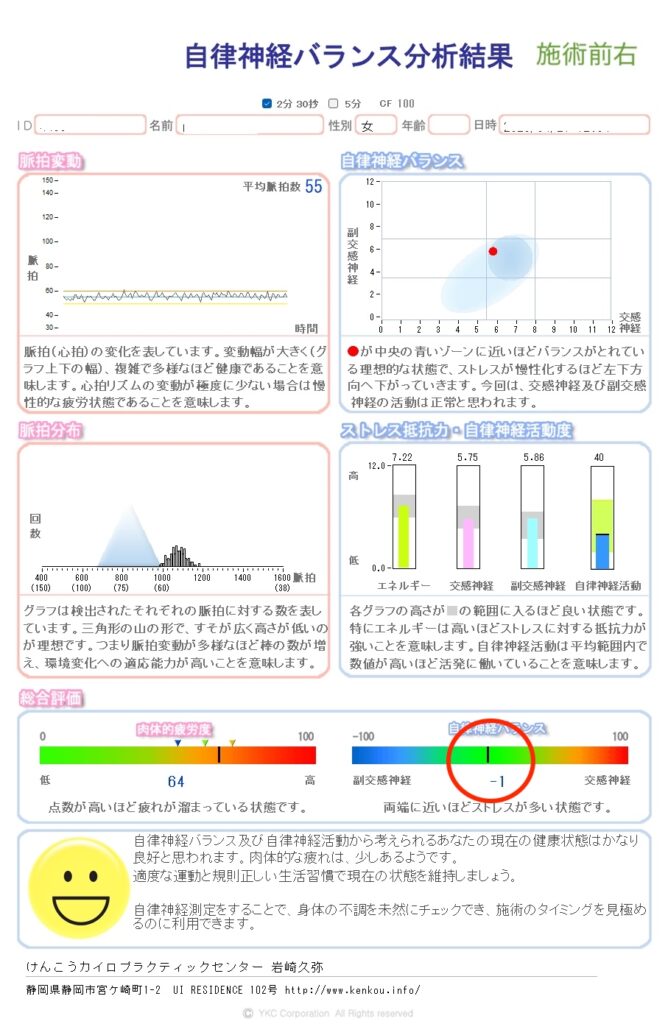問診の時に、自律神経バランス測定をしてみると、副交感神経が活発になっていました。自律神経バランス測定結果 施術前左