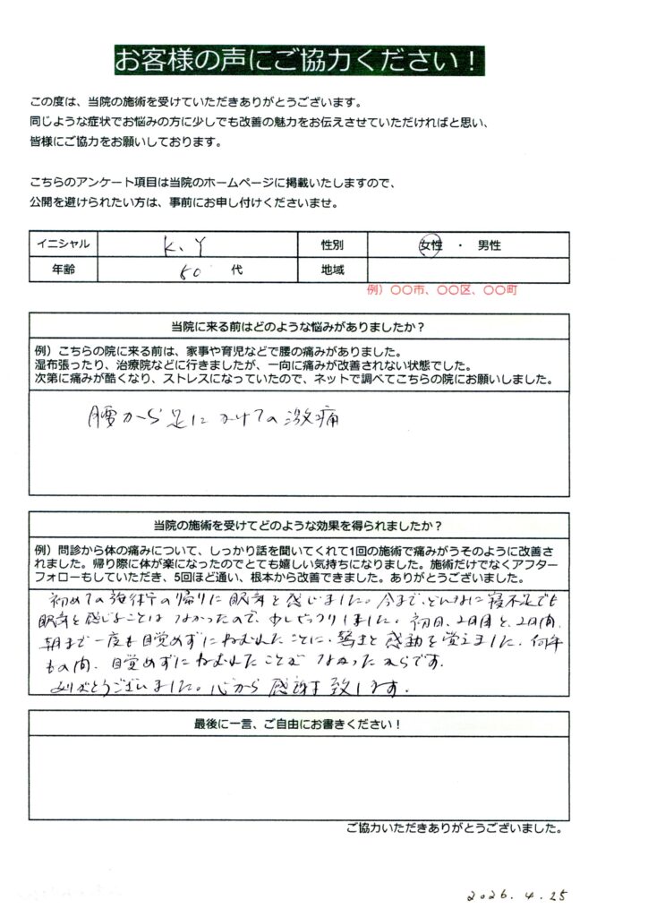 【お客さまの声】腰の激痛が改善した|初回施術後にぐっすり眠れた