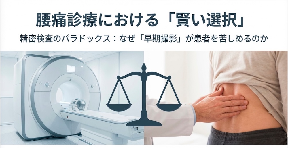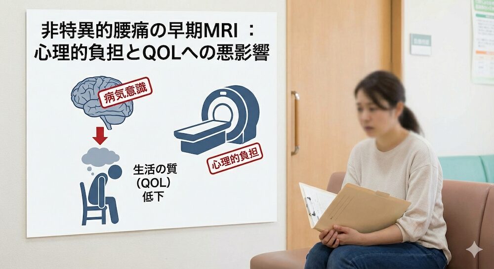レッドフラッグ(重大な脊椎疾患の兆候)がない非特異的腰痛に対して早期にMRI検査を行うと、クライアントの「自分は病気である」という意識を強めてしまい、生活の質(QOL)に悪影響を及ぼすことが指摘されています。また、検査そのものが心理的負担を引き起こす「マイナス面」があることも明らかになっています。