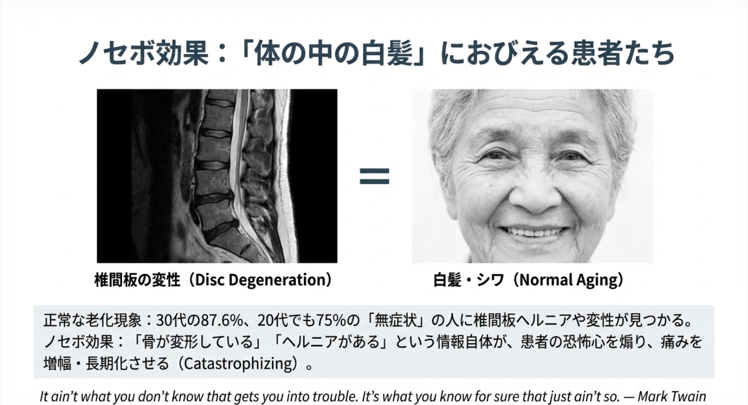 患者は「椎間板の膨隆(disc bulge)」「靭帯肥厚」「骨減少症」といった、専門医から見れば臨床的にほとんど意味がない、あるいは加齢に伴う「シワ」のような正常な変化に対しても、極めて強い懸念を抱く傾向があります。