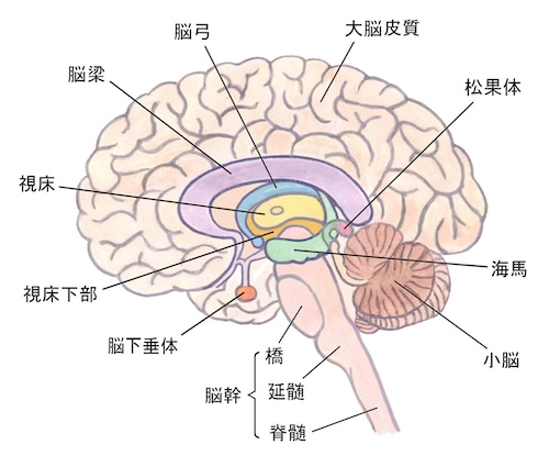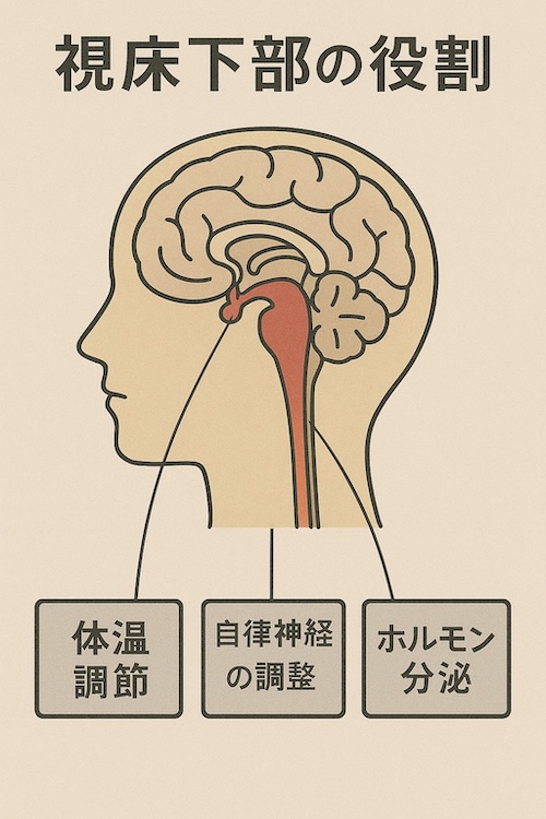 ここで登場するのが、脳の中心部にある視床下部(ししょうかぶ)。視床下部は「ホルモン」と「自律神経」の両方をコントロールしており、いわば身体の司令塔です。
