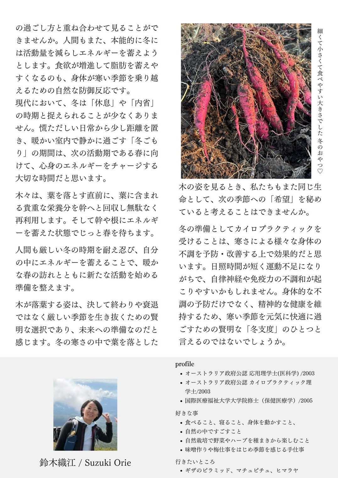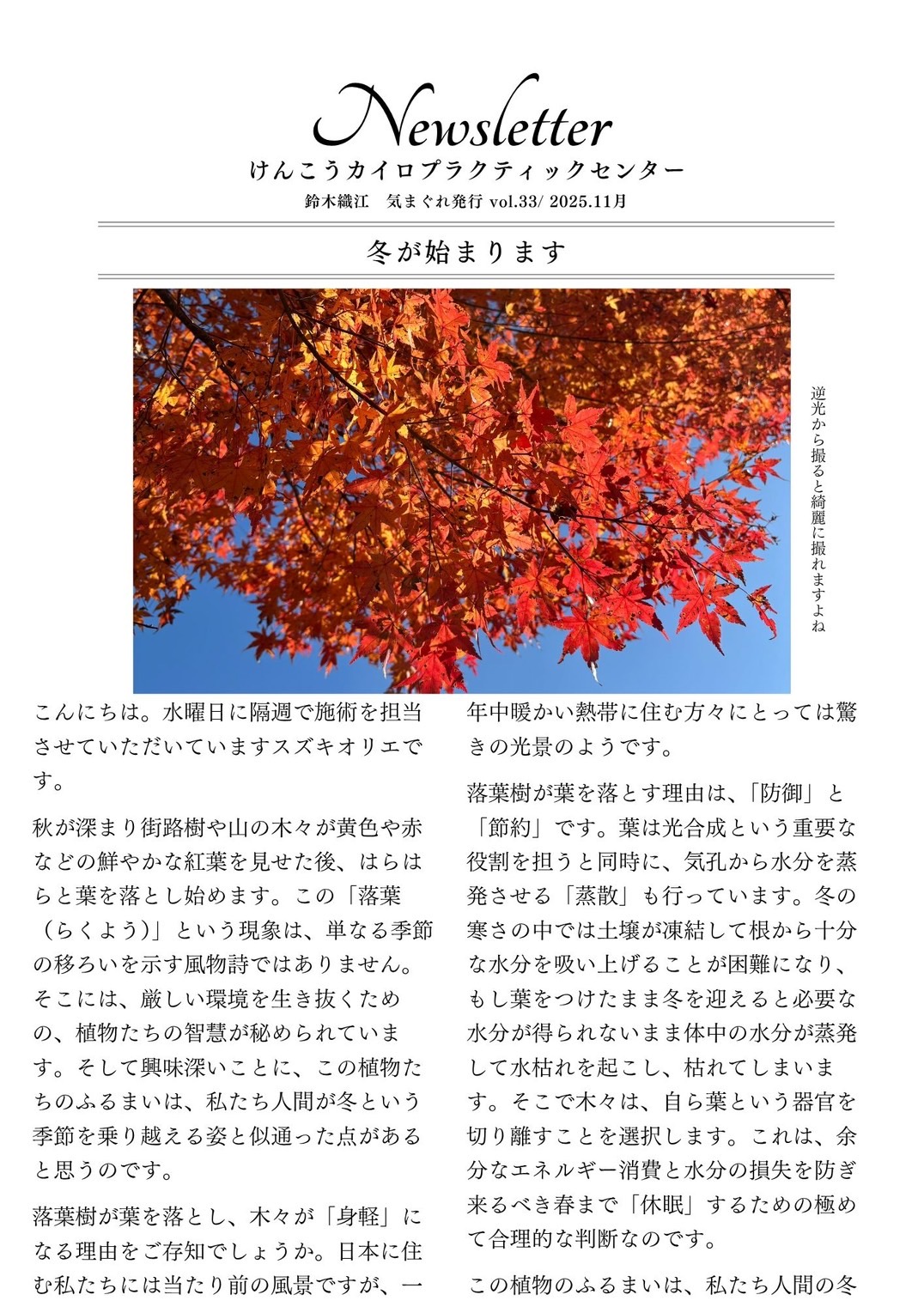 ニュースレター オリエ先生 vol.33- 2025年11月27日発行 こんにちは、けんこうカイロプラクティックセンター 岩崎久弥です オリエ先生のニュースレターアップします。 いかがでしたか。紅葉の写真とってもキレイでしたよね。私はまだ紅葉見ていません おすすめの関連記事 オリエ先生ニュースレターVOL.7 ニュースレター 鈴木織江 vol.19- 2025年6月発行 けんこうカイロニュースレター 2025年6月15日(日) 32号 けんこうカイロニュースレター 2025年7月14日 37号 ご予約・お問い合わせはこちら 054-221-0125タップで電話をかける LINEから予約お問合わせする 前の記事へ 次の記事へ 所在地 当院までの道案内はこちら
