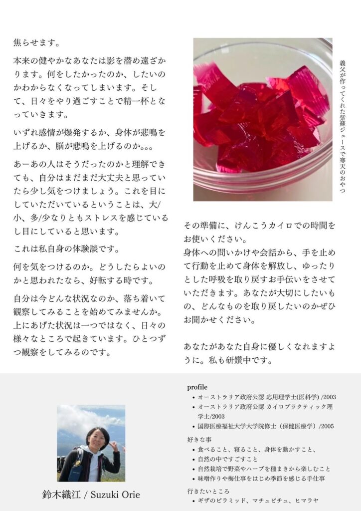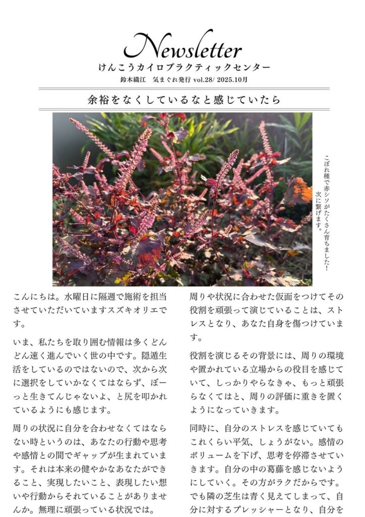 ニュースレター 鈴木織江 vol.28- 2025年10月14日発行 オリエ先生のニュースレターをアップします。 私は、水曜日にオリエ先生の施術をうけていますが、やっぱり毎週施術を受けたいです。 おすすめの関連記事 ニュースレター 鈴木織江 vol.23- 2025年9月発行 ニュースレター 鈴木織江 vol.13- 2025年3月発行 ニュースレター 鈴木織江 vol.17- 2025年6月発行 ニュースレター 鈴木織江 vol.27- 2025年10月7日発行 ご予約・お問い合わせはこちら 054-221-0125タップで電話をかける LINEから予約お問合わせする 前の記事へ 次の記事へ 所在地 当院までの道案内はこちら