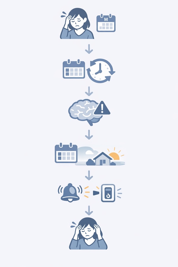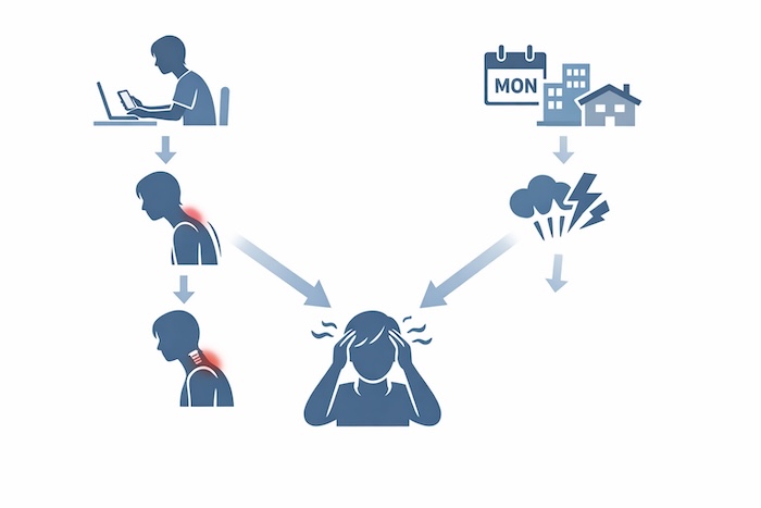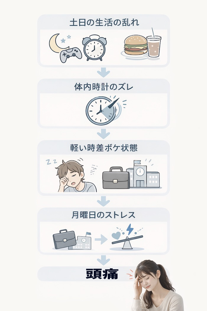 さらに見逃せないのが、土日の過ごし方です。 ・夜更かし ・朝寝坊 ・食事時間の乱れ これらによって体内時計がズレ、月曜日は軽い“時差ボケ状態”になります。 その状態でストレスが加わると、 自律神経のバランスが崩れ、頭痛が出やすくなるのです。