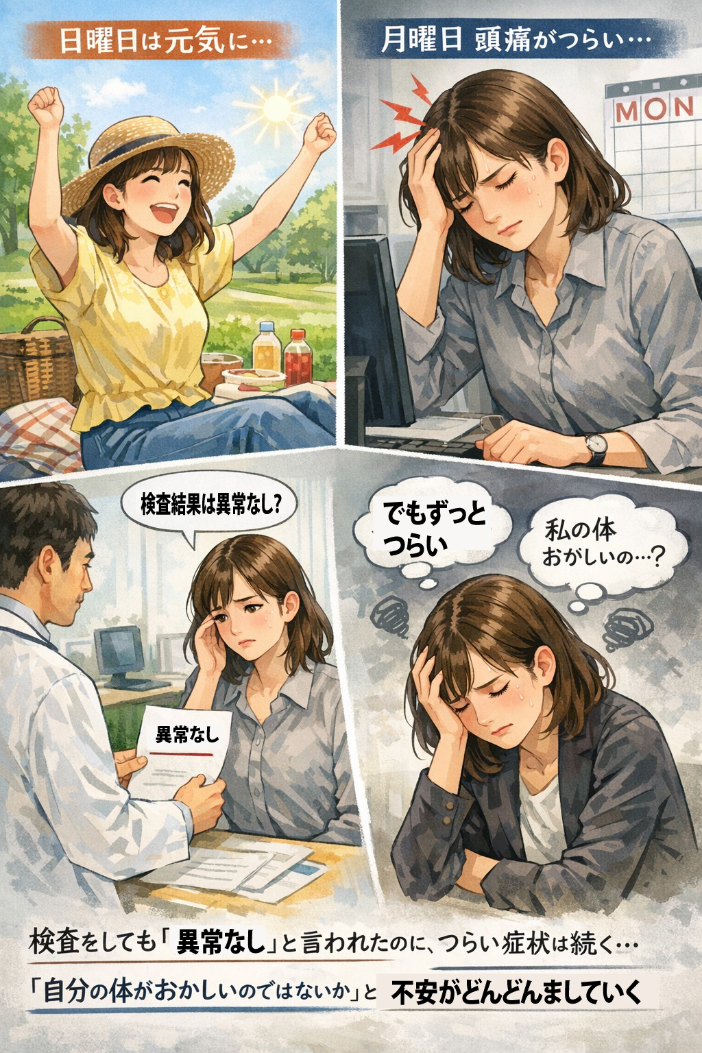 〜それは体の異常ではなく“脳の反応”かもしれません〜 「日曜日までは元気なのに、月曜日になると頭痛が出る」 このようなご相談を、当センターでも多くいただきます。 検査をしても「異常なし」と言われたのに、つらい症状は続く…。 「自分の体がおかしいのではないか」と不安になる方も少なくありません。