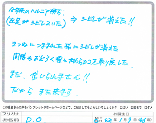 愛知県から18年間椎間板ヘルニアの痛みとシビレのお客さま(Dさん)が来院