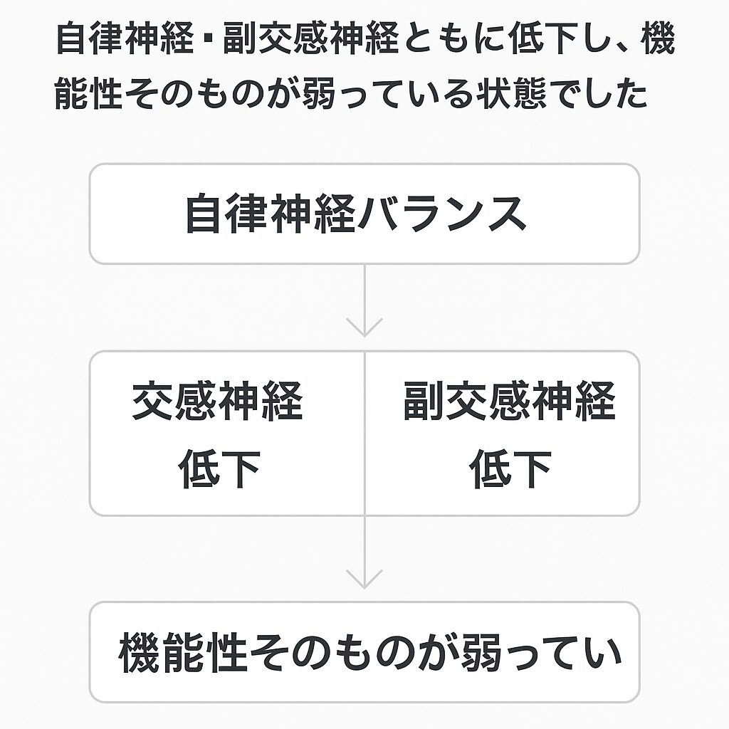 まず自律神経バランス測定を行ったところ、交感神経・副交感神経ともに低下し、機能性そのものが弱っている状態でした。施術後の変化