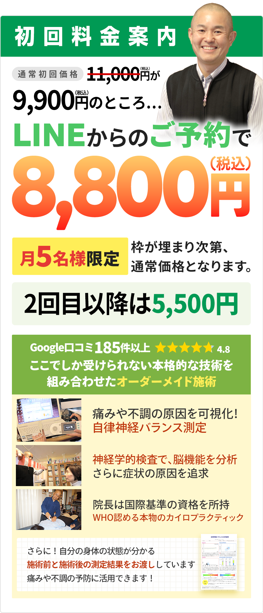 けんこうカイロプラクティックセンターでは、痛みの原因である「神経の緊張感」「筋肉のこわばり」を改善させる施術をします。